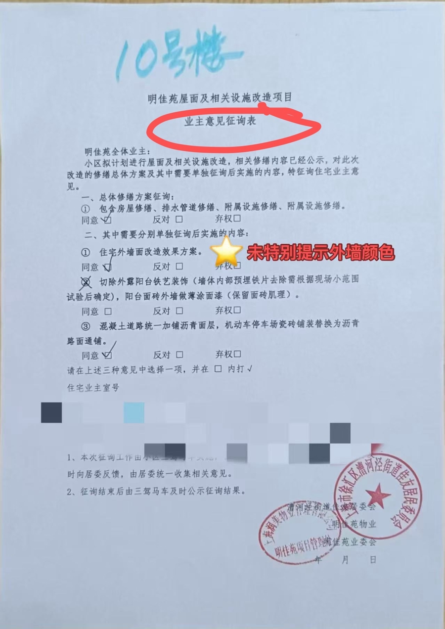 居民成先生指出,当初的征询单和公示中并未标明外立面会从粉橙色变为米白色,仅在通知中提到“具体改造方案可至居委会翻阅”,没有特别提醒颜色变更。