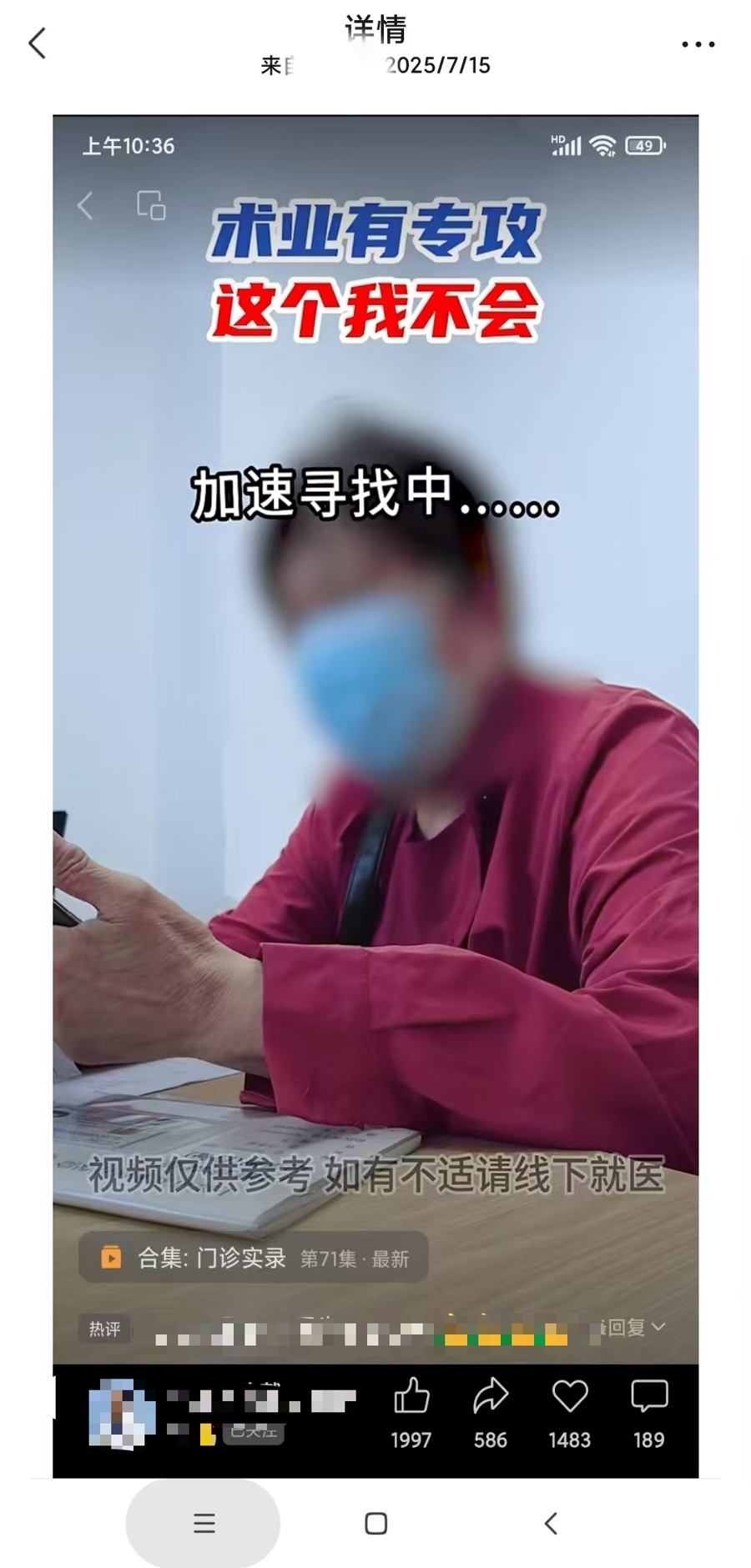 医生账号公开发布的视频中,仅对患者面部进行小范围打码。(受访者供图)