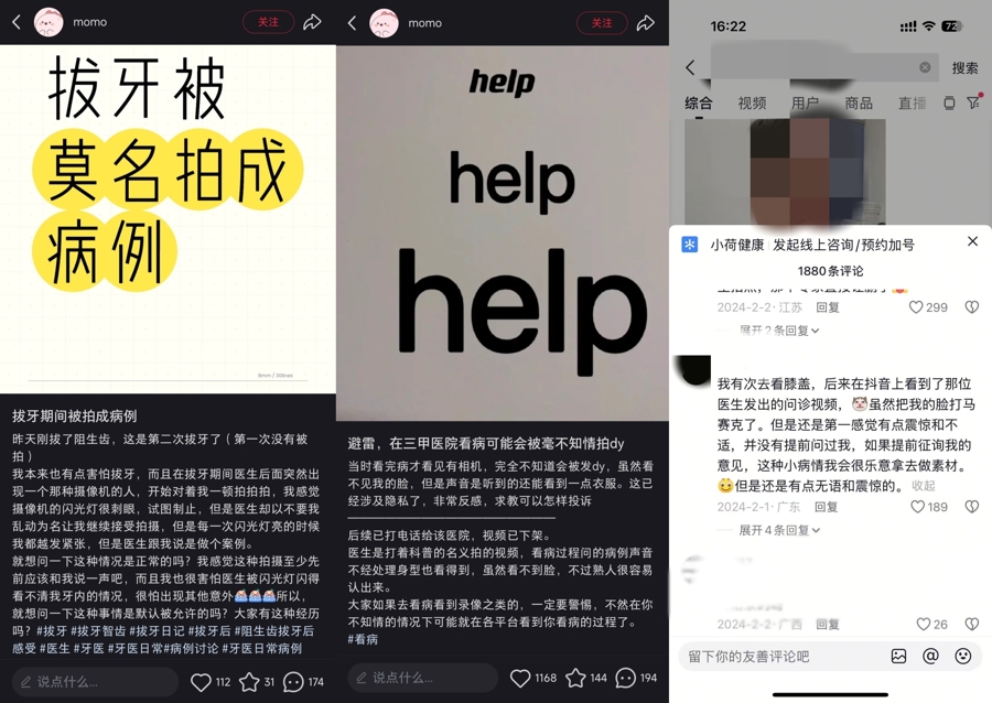 在社交平台上,不少网友留言反映了和李女士一样的遭遇,患者作为公开发布视频里的主要人物,知情同意权未被充分尊重:有人在拔牙期间被拍摄,医生告知会被用作“案例”;有人在就诊期间看到了相机,可拍摄人员并未明确告知用途;有的则干脆不知道被拍摄,视频直接发布在社交平台上,直到患者发现或投诉后才下架……
